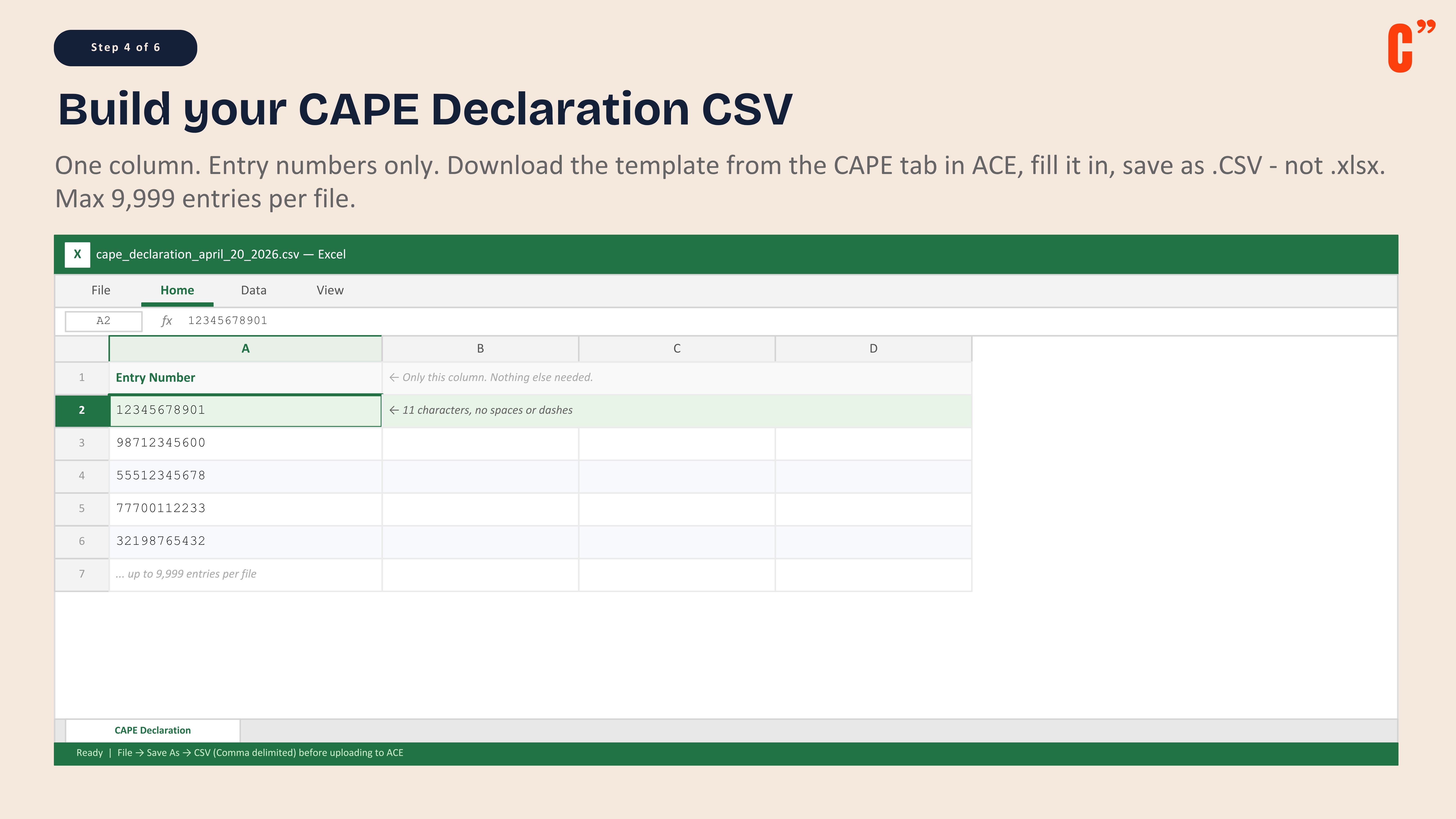 Inside ACE, find the CAPE tab and download the CAPE Upload Template. It's a simple Excel file with one column: Entry Number. No amounts, no dates, no additional information needed. CBP has also published a CAPE Quick Reference Guide that walks through the filing mechanics.