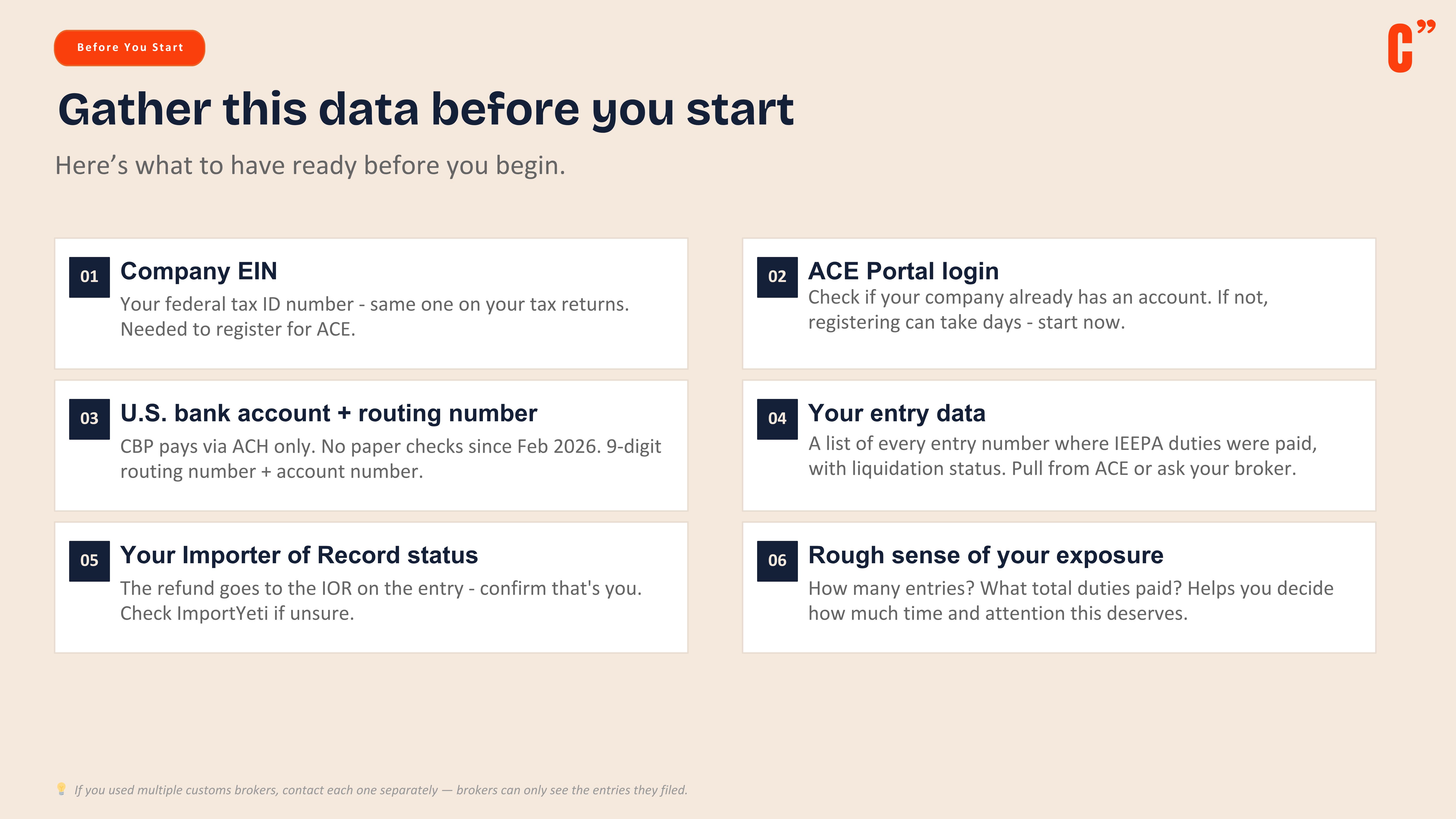 You don't need an exact number before you start, but it helps to know whether you're dealing with dozens of entries or thousands. A $10,000 refund and a $10 million refund go through the same process - but the data preparation looks very different. If your broker can give you a rough total of IEEPA duties paid alongside the entry list, use that number to decide how much time and attention this deserves.