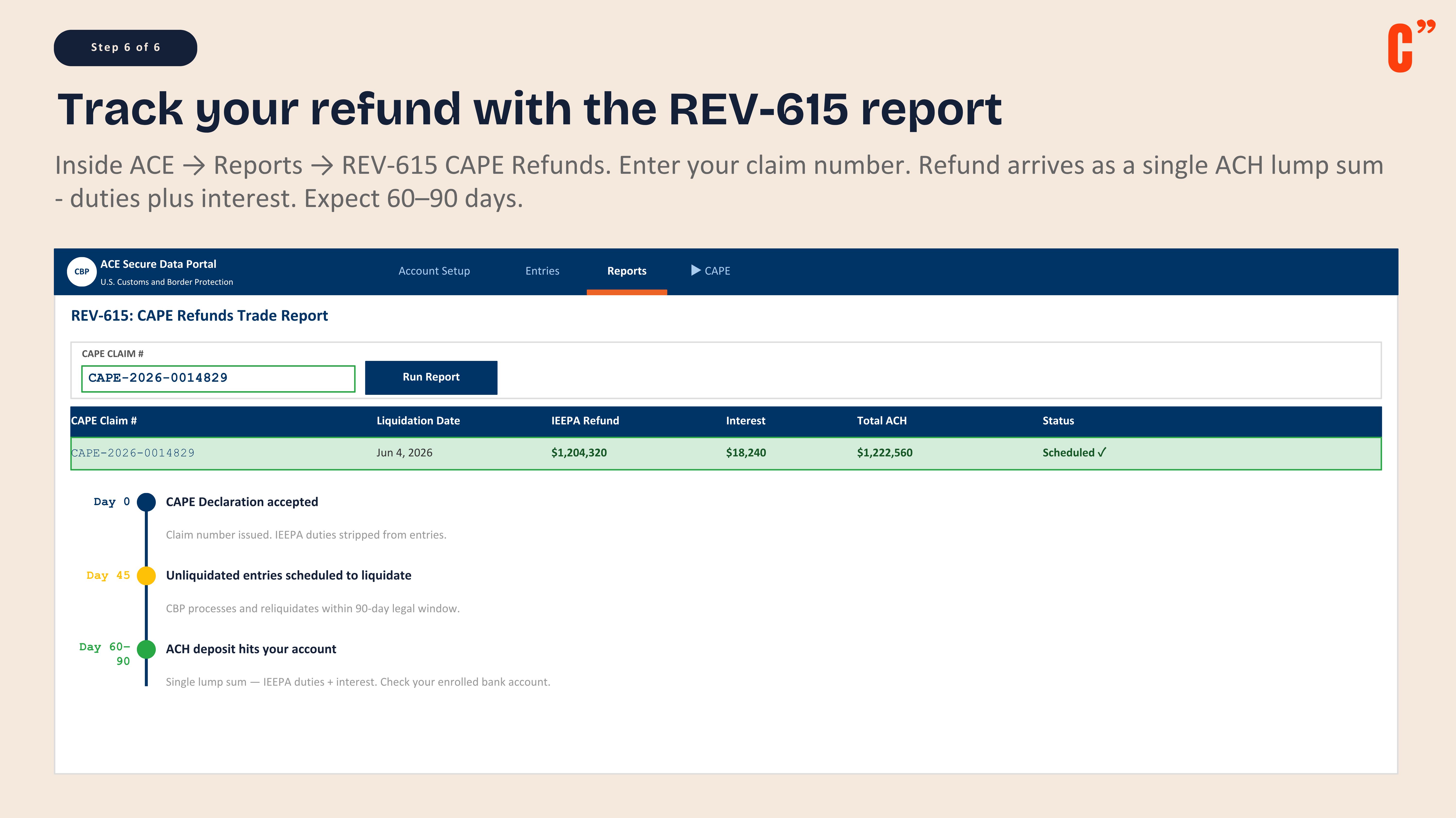 Inside ACE, go to Reports and run the REV-615 CAPE Refunds Trade Report. Enter your CAPE claim number. You'll be able to see the status of your entries and, eventually, the refund amount and scheduled deposit date.
