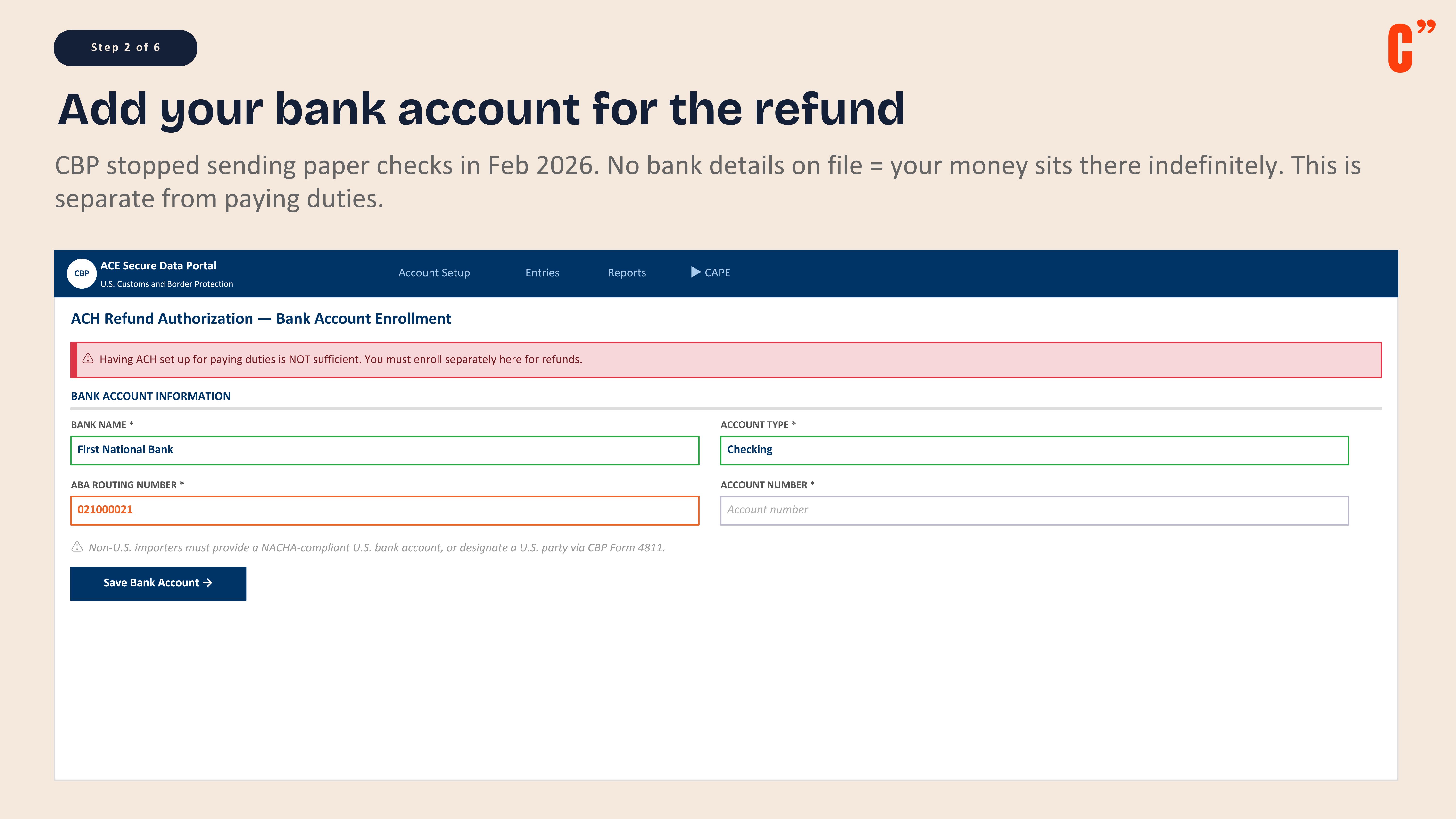 Why it matters: As of February 2026, CBP no longer sends paper checks. Every refund goes out electronically, straight to a bank account. If your bank details aren't on file, CBP will hold your refund until they are. The money just sits there.