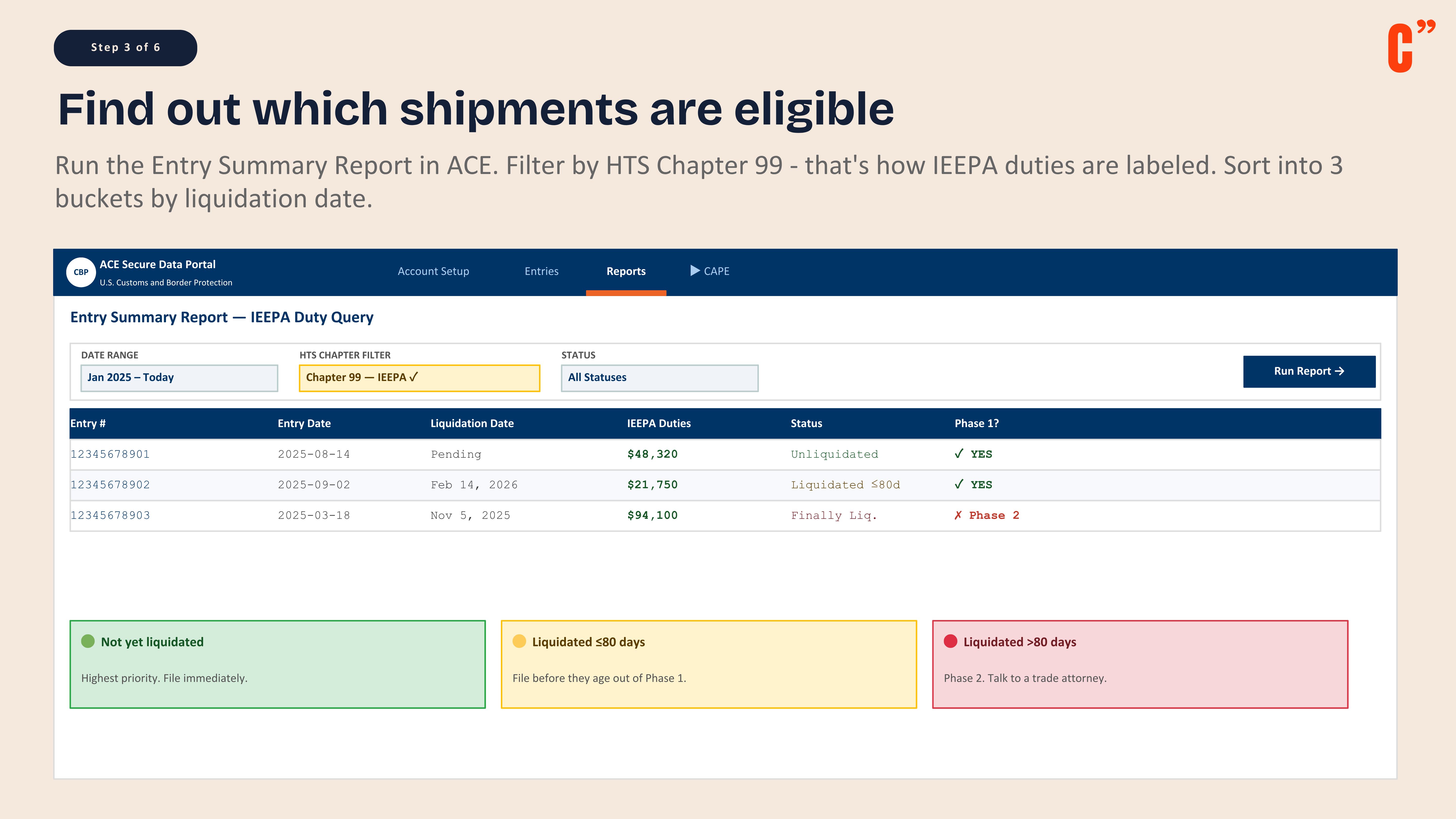 What you're doing: Running a report inside ACE to identify every shipment on which you paid IEEPA tariffs.