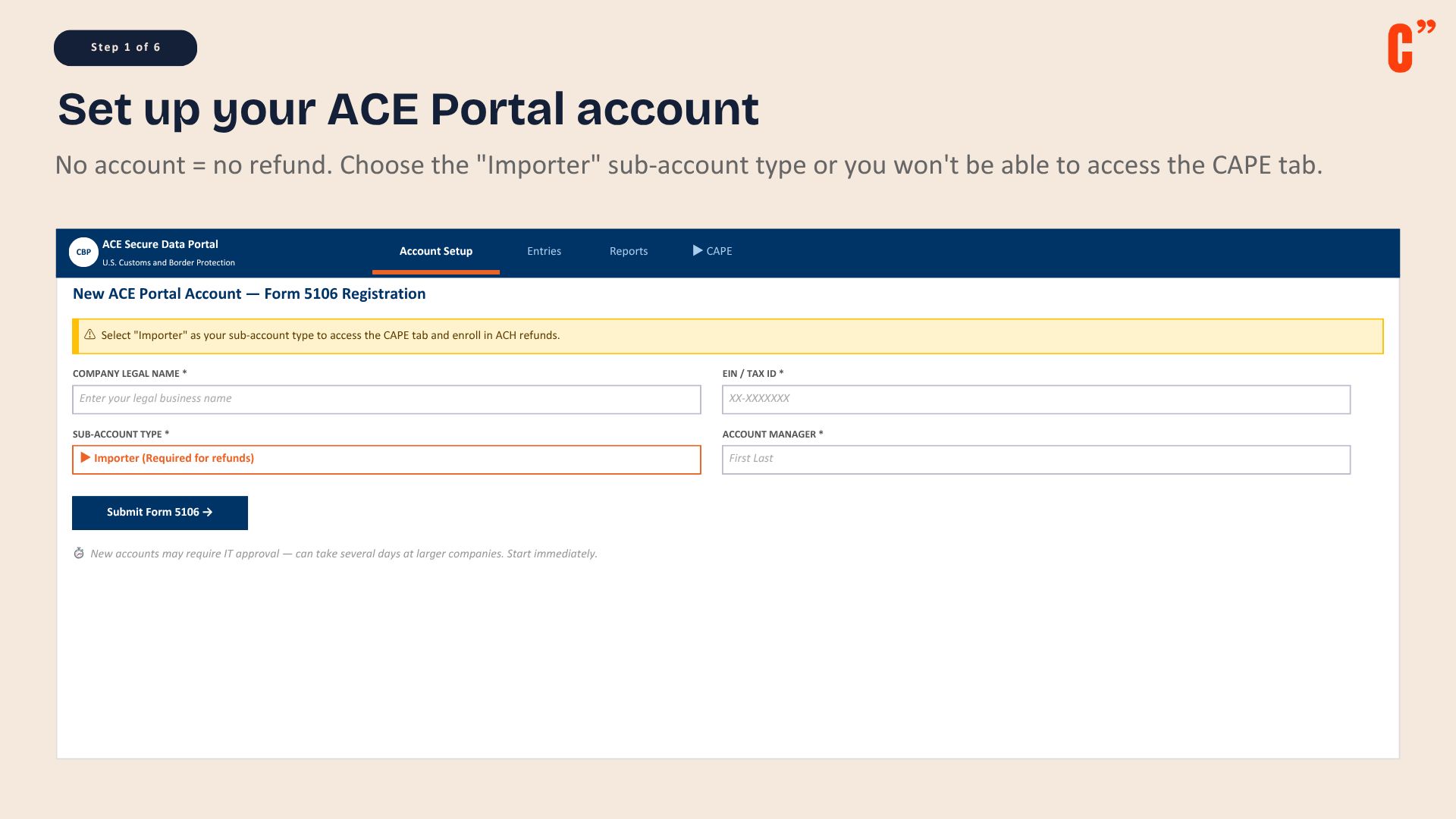 Go to ace.cbp.dhs.gov. Register for an account using Form 5106. If you already have an account, skip straight to checking that you have an Importer sub-account - that's the specific account type that unlocks the CAPE tab and ACH refund enrollment. Without it, you can't file.