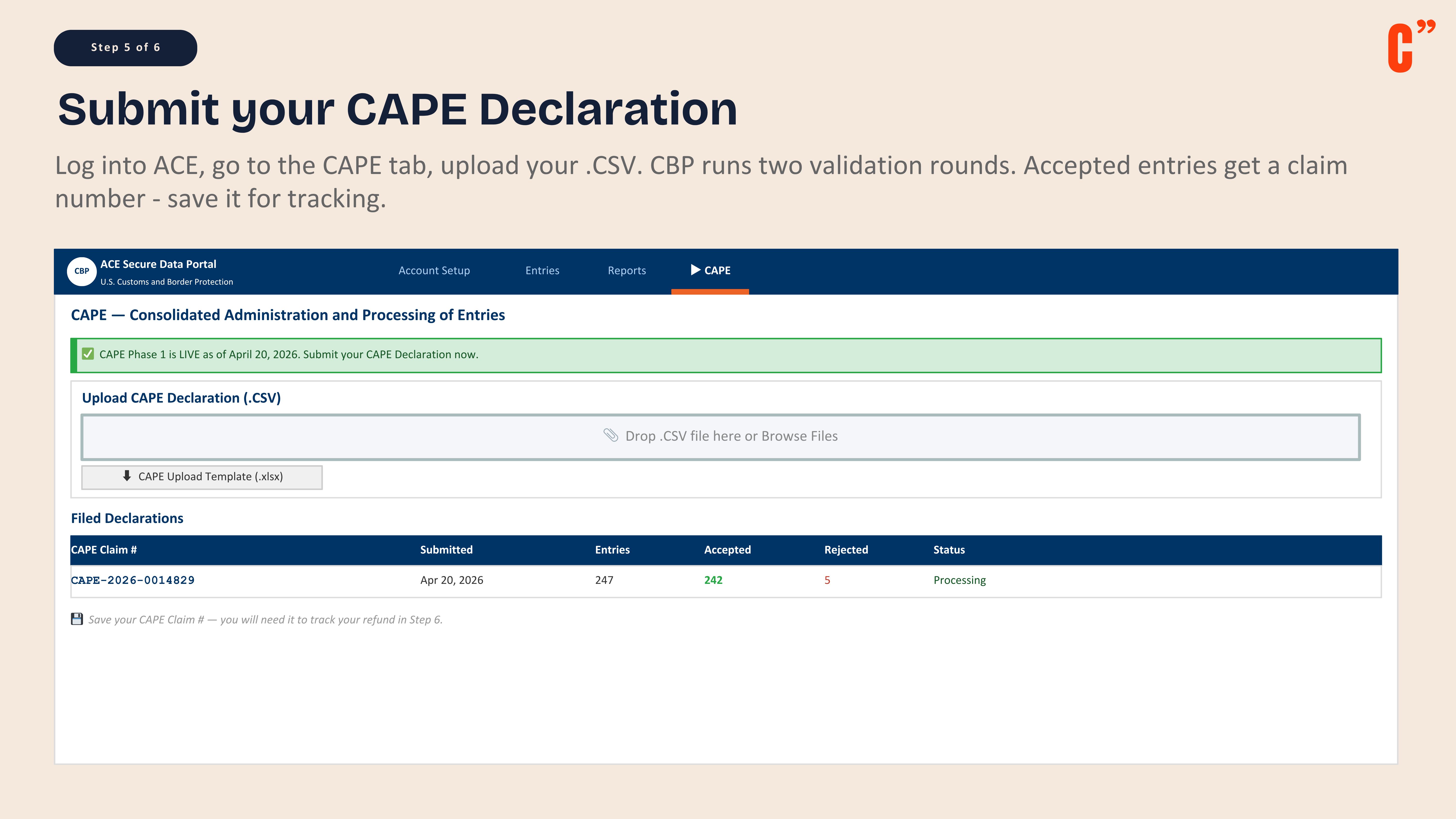 Entries that pass both rounds get accepted. You'll receive a CAPE claim number — a reference ID that tracks your filing. Save it, because you'll need it to monitor your refund in the next step.
